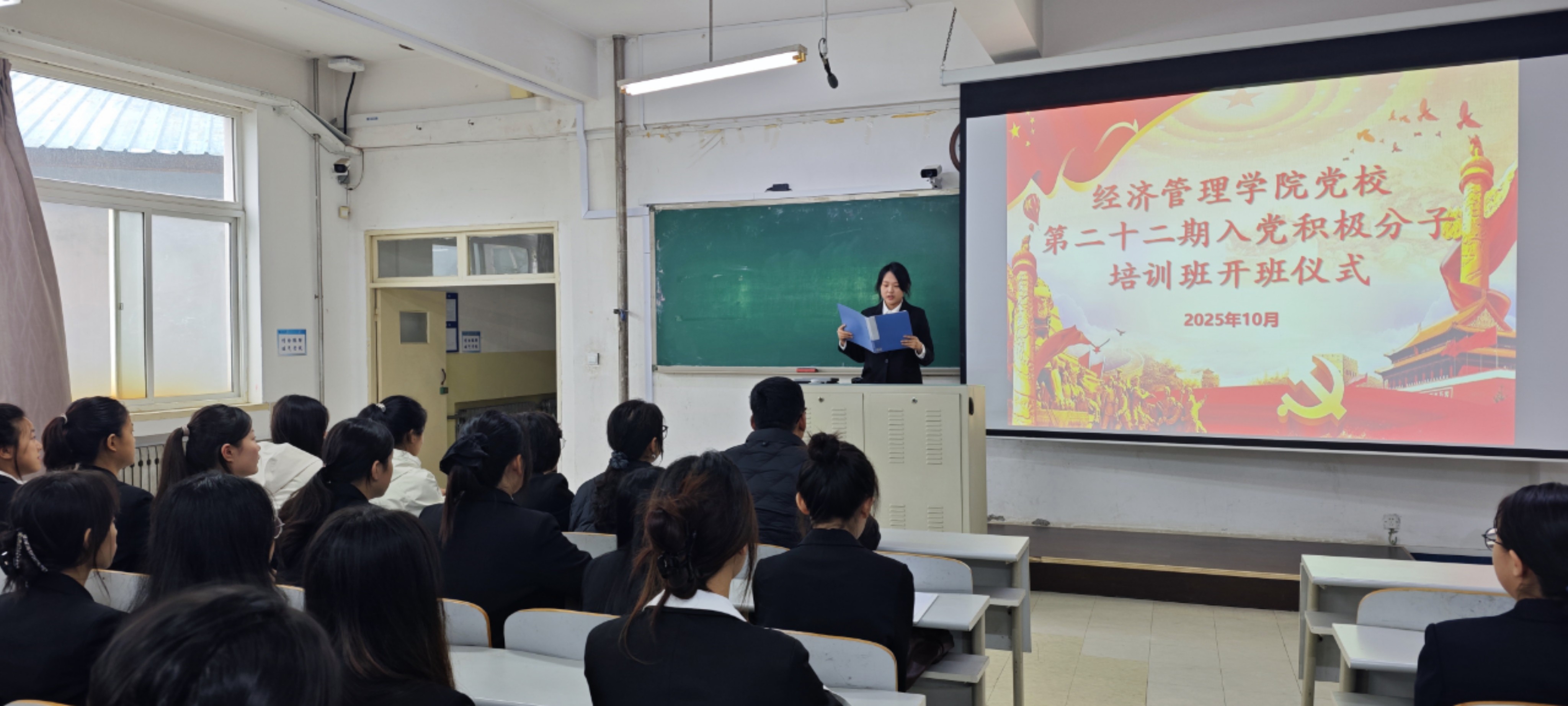 为进一步强化入党积极分子的思想建设,增进其对党的认知与理解,推动党员发展工作有序开展,伟德victor1946网站于 2025年10月11日在大黑石校区第二教学楼202教室举行了第二十二期入党积极分子培训班开班仪式。公司党委书记范庆华,本科生党支部书记佟宁宁,辅导员石秀琪、刘子琦、唐佳楠出席了本次开班仪式。