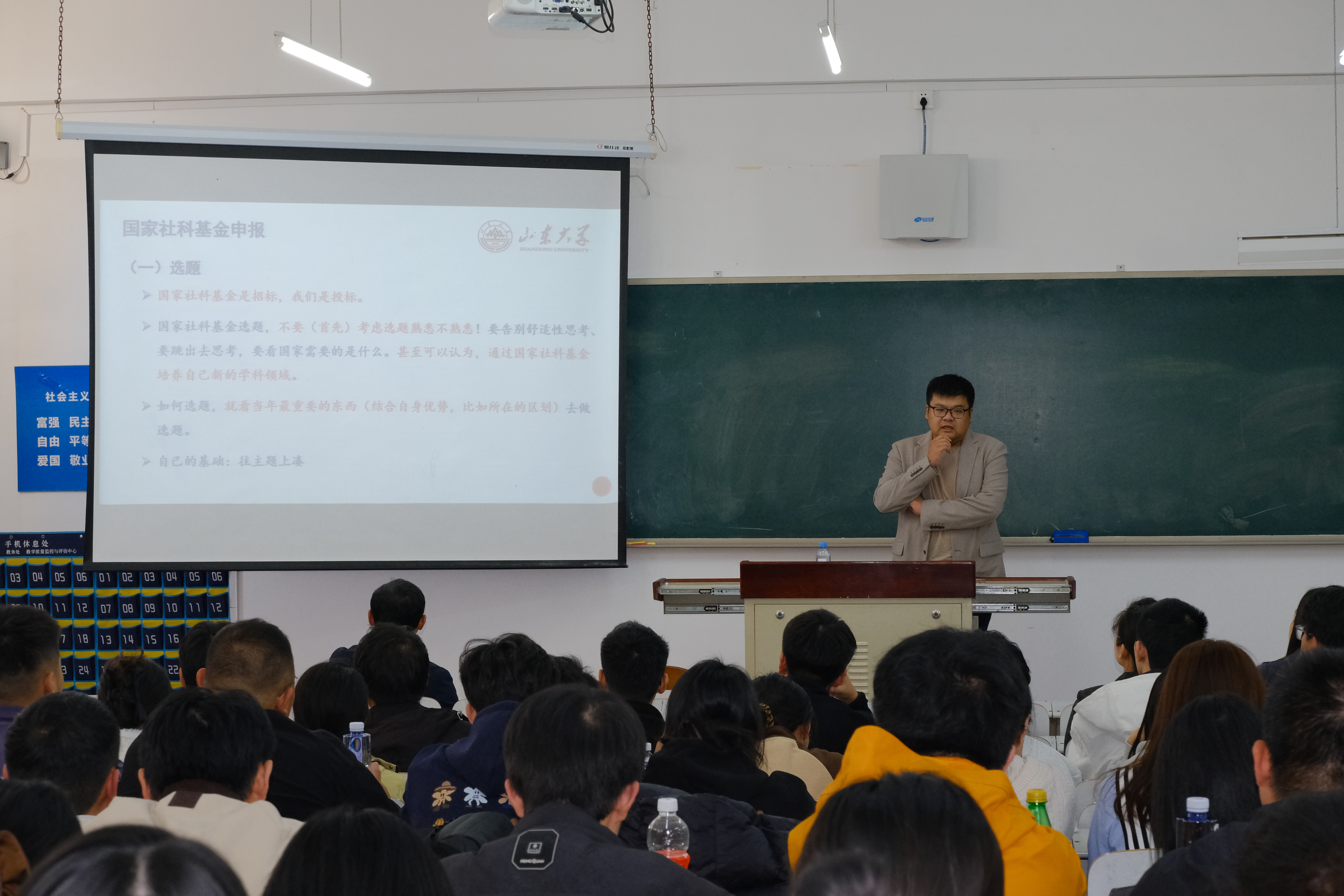 讲座中,蒋鹏副教授结合自身多年的学术研究与指导经验,从课题申报与高水平论文写作两大核心板块展开讲解。针对课题申报,他系统梳理了选题与政策导向契合度、论证逻辑严谨性、申报材料打磨等核心要素,强调学术研究需兼顾创新性与实用性;在SSCI、SCI论文写作部分,他聚焦文献综述、研究方法选择、逻辑框架构建等重点内容,通过典型案例剖析常见问题,并分享了论文投稿与返修回复的实用策略。现场学术氛围浓厚,师生们专注聆听并认真记录。